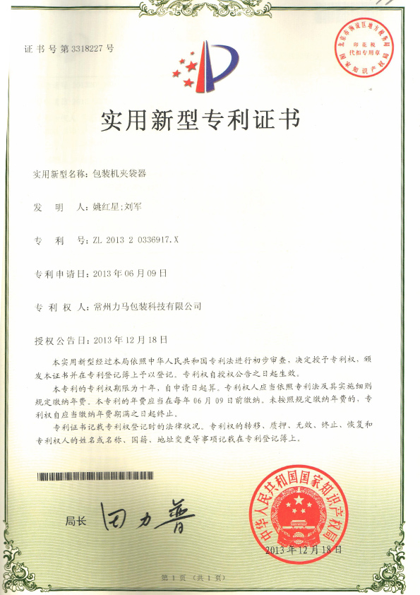 包裝機夾袋器專利證書