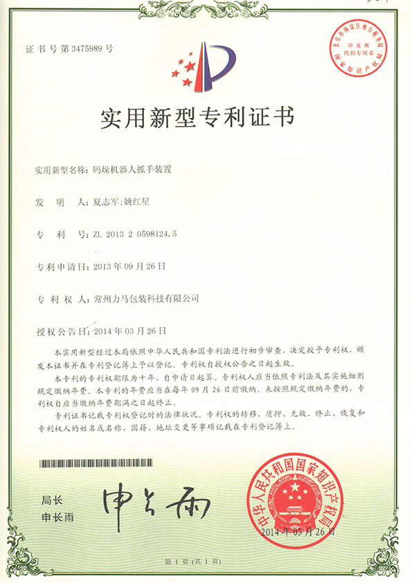 碼垛機器人抓手專利證書