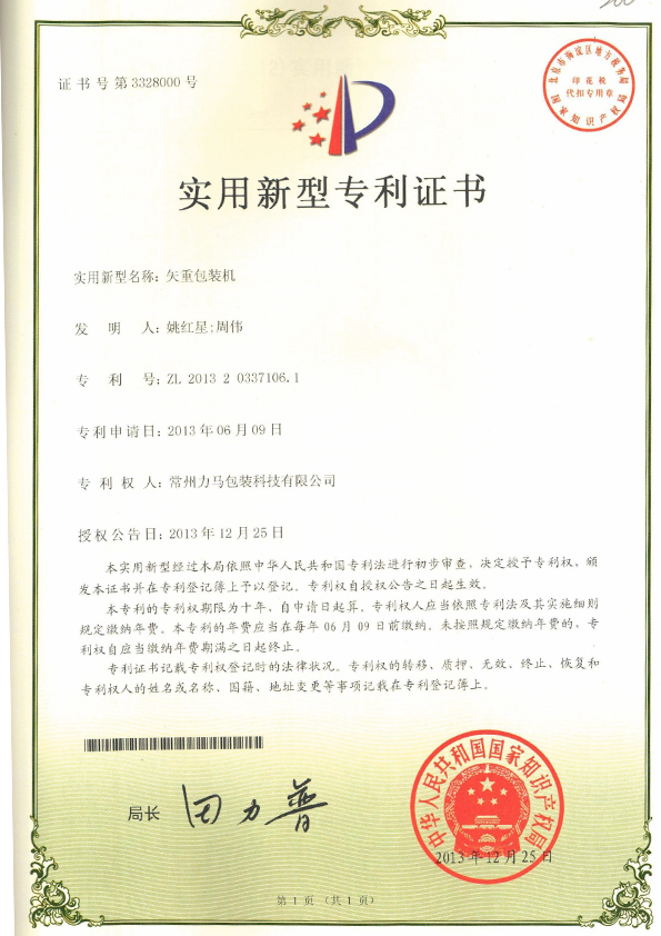 垂直螺旋包裝機專利證書